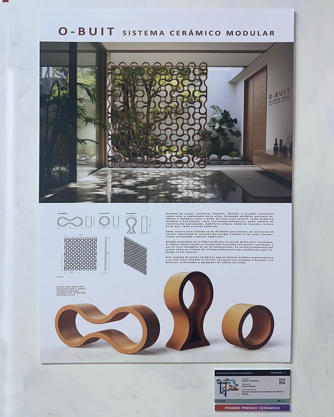 Nuestra alumna África Macias ha sido galardonada con el primer premio en la categoría cerámica del Certamen de Talentos Emergentes en CevisamaLab 2025. Su innovador proyecto, O-BUIT, destaca por su diseño modular y versátil, con aplicaciones en celosías y construcción.