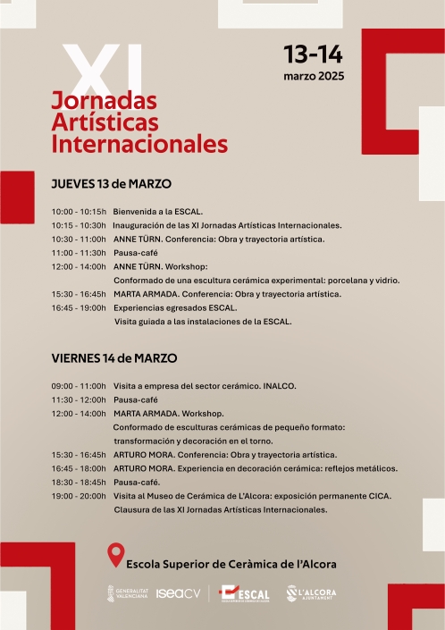 Els pròxims 13 i 14 de març de 2025, l’Escola Superior de Ceràmica de l’Alcora (ESCAL) acollirà les XI Jornades Artístiques Internacionals, un esdeveniment que reunirà artistes i experts de prestigi en el món de la ceràmica.
